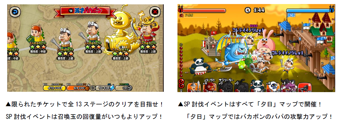 バトル内の「SP討伐イベント」から、コラボSP討伐イベント「天才バカボンコラボSP討伐」に挑戦できます。本SP討伐イベントには、「バカボンのパパ」が敵として登場! 1日1枚配布される「ひとりで」のチケット消費でのみ討伐に挑戦できます。また、SP討伐イベントは敵の城を落城させないとステージクリアとならない特別ルールとなっており、難易度「初級」から「上級」までの全13ステージあります。「バカボンのパパ」を倒し、ステージクリアを目指しましょう!※SP討伐に挑戦できる回数は毎日4:00 にリセットされます。