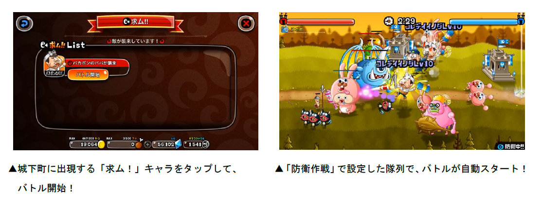 『城とドラゴン』に突如現れた「バカボンのパパ」の退治を目指すコラボ襲来イベント「バカボンのパパ襲来なのだ!」を開催いたします。コラボ期間中、1日最大2回、プレイヤーの城に突如「バカボンのパパ」が攻めてきます。「バカボンのパパ」が出現した際は、城下町に「求ム!」キャラが登場し、プレイヤーにお知らせしてくれます。襲来イベントは「防衛作戦」を使用して敵軍を自動で迎え撃ち、勝敗によって獲得できる報酬が変わります。また、金の城が出現した際には、「ルビー」「レアアバター券」「ドラゴンメダル」が必ずもらえますので、襲来に備えて防衛隊列を整えましょう!