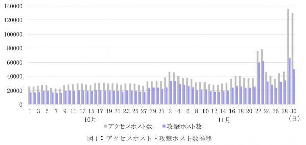 図1に示す通り、11月期もIoT機器への攻撃が継続的に行われています。当観測システムでは、11月は1日当たり約4.6万IPアドレスからのアクセス(アクセスホスト数)、約2.9万IPアドレスからの不正な侵入(攻撃ホスト数)を観測しています。10月と比較して、11月の総アクセスホスト数は52%増加し1,378,146件、総攻撃ホスト数は42%増加し888,115件となりました。図1に示したとおり、11月22、23日、11月29、30日の2回の突出した箇所があります。これは攻撃者が何らかのオペレーションを実施したものと考えられます。