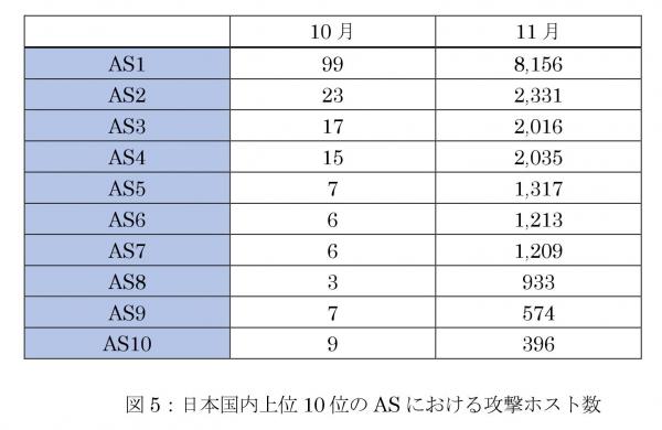 日本国内での攻撃ホストの増加(図5)については、観測されたAS(ISP)数は11月の14日から18日に拡大、そのほとんどで攻撃ホスト数が100倍近く増加しており、8月のような特定のAS(ISP)ではなく、国内全域にIoTウイルス感染機器が増加したものと推測されます。