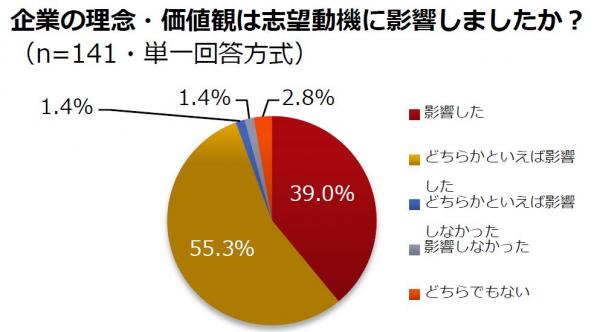 当社が2016年に内定者200名に行ったアンケート調査では、企業の理念・価値観が志望動機に影響したと回答した学生は39.0%にのぼり、どちらかといえば影響したと回答した学生55.3%を合わせると、実に94.3%の学生が企業の理念・価値観が志望動機に影響していることが分かりました。