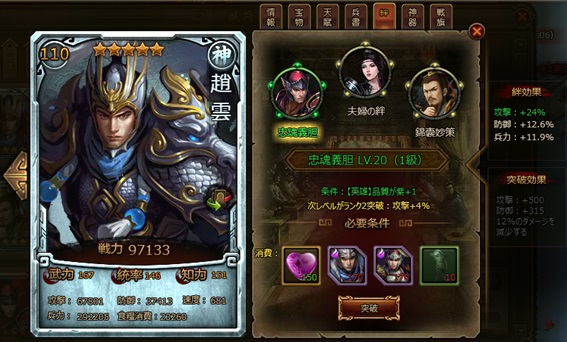 また武将を育成する方法は数多くあり、中でも内なる力を解放する「天賦」や、他の武将との友好度で成長する「絆」などの強化することが強くなるために重要となります。