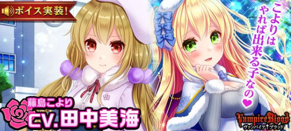ソーシャルゲーム開発を行う、株式会社テンダ(本社/東京都豊島区、 代表取締役社長/小林 謙)は、「mobage(モバゲー)」など各ゲームプラットフォームで提供中のソーシャルゲーム『ヴァンパイア†ブラッド』にて本日12月20日(水)より「<UR>藤島こより(CV.田中美海)」のボイス付カードを期間限定で追加したことをお知らせいたします。