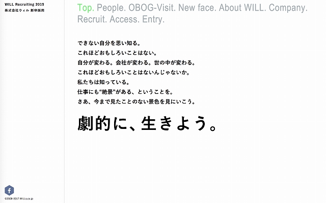 私たちは、できない自分を思い知ること、自分が変わり、会社が変わり、世の中が変わることをこの上なく面白いと思っています。逆に、変化を嫌う人には合わない会社とも言えます。それを、サイトトップで明確に示しています。「仕事にも“絶景”がある」ということを明言し、「劇的に、生きよう。」と語りかけています。