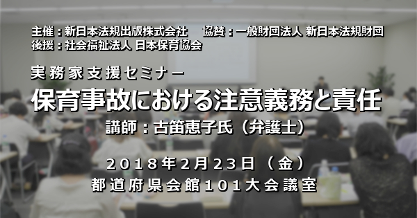 新日本法規出版株式会社(所在地:愛知県名古屋市中区栄1丁目23番20号、代表取締役:服部昭三 http://www.sn-hoki.co.jp/) は、古笛恵子弁護士を講師に迎え、実務家支援セミナー『保育事故における注意義務と責任』を2018年2月23日(金) 東京で開催します。