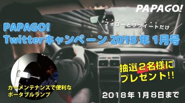 PAPAGO JAPAN株式会社は、抽選で2名様にプレゼントが当たる!「PAPAGO!Twitterキャンペーン2018年1月号」を2018年1月8日(月)まで実施いたします。