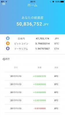 ログインすると、ホーム画面の上部にあなたに総資産、日本円残高、ビットコイン残高、イーサリアム残高が表示されます。下部はあなたの仮想通貨の送受信履歴が表示されております。