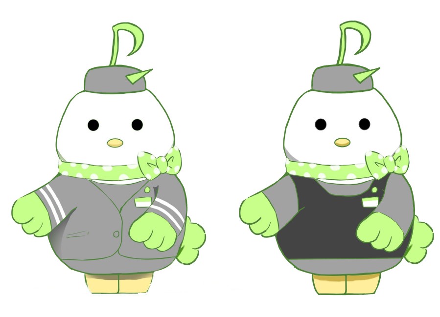 ソラシドエアのユニフォームを着た渡り鳥がモチーフの笑顔を配る新人CA「ソラシドリ」。