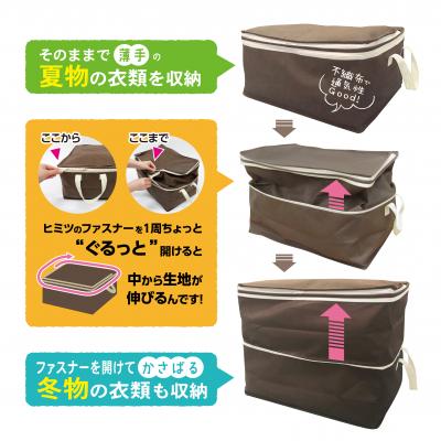 ヒミツのファスナーを閉じて使用すれば薄手の夏用衣類やふとんが、開いて使用すればかさばる冬用衣類やふとんがスッキリと収納できます。