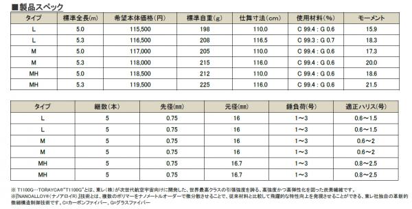また、胴調子の竿にありがちなダルい振り感も、TORAYCA(R)T1100カーボンを使用することで竿ダレが少なく、比較的操作しやすい竿に仕上がっています。そして何より、TORAYCA(R)T1100G の最強の強度によって限界まで細身にすることが可能となり、非常に粘り強い調子に仕上がりました。