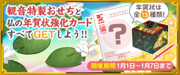 お参り先「2561年西方極楽浄土」では、限定カードとして【年賀状】(全13種類)が獲得できます。【年賀状】カードは、強化合成専用のカードとなっています。