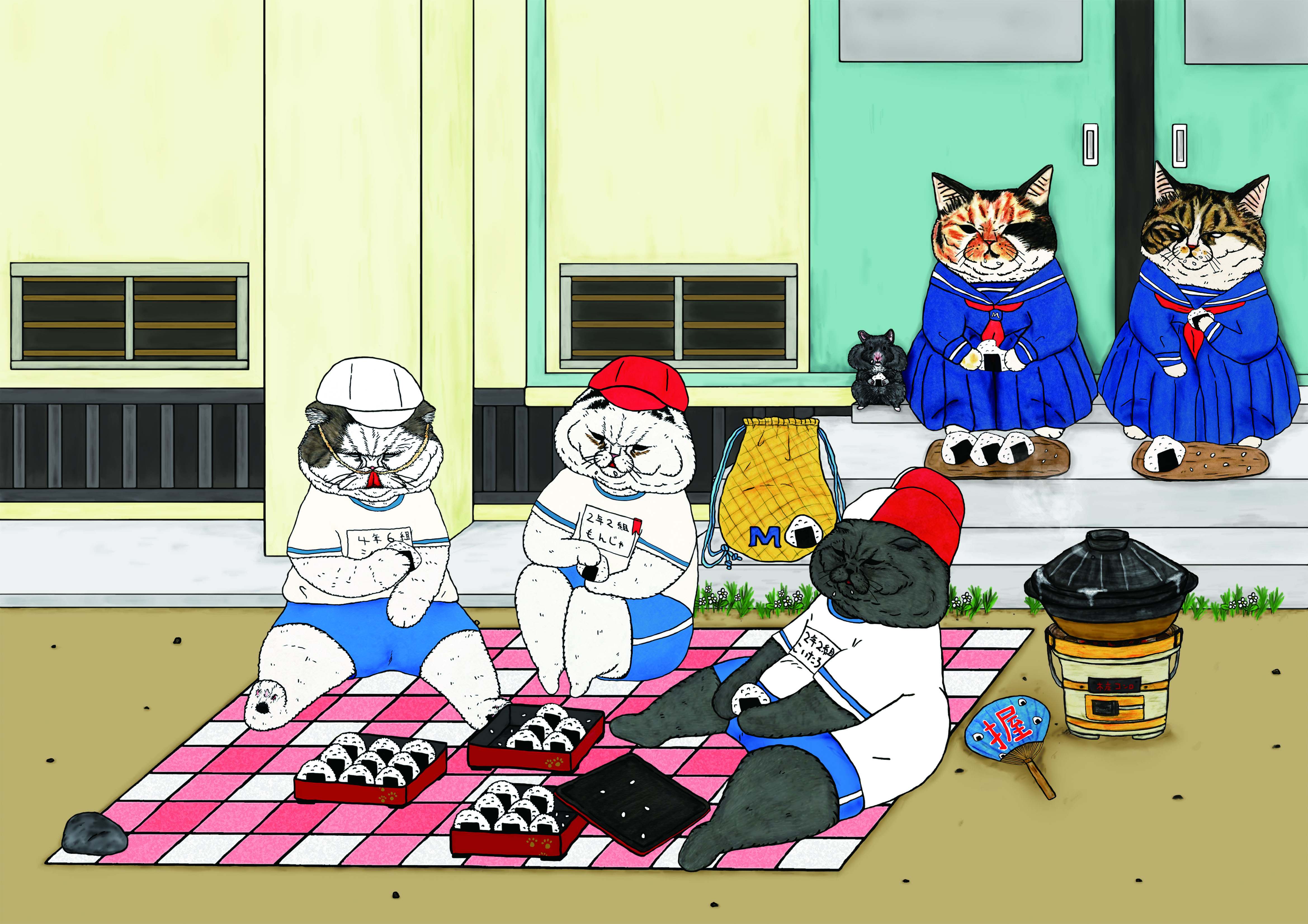 顔面深くシワが刻まれた渋い顔立ちの猫たちが、酒をあおり、銭湯に浸かり、一家団欒の時を過ごす……。斬新でありながらどこか懐かしさを覚えるのは、その舞台となる街並みや家屋に、昭和の残香を感じるからだろう。古きよき日本の原風景には、猫がよく似合う。しかしこれは普通の猫ではない。「人面猫」ならぬ「猫面人間」とでも言うべきか……いややっぱり人間ではない、まぎれもなく「猫」である。猫という生きものの特徴を如実に捉えた写実的な顔立ちでありながら、彼らが二足歩行であることに何らの違和感もない。また時に猫たちは服を着ているが、飼い猫のコスプレのような“やらせ感”やいわゆる猫キャラにありがちな“可愛さの押し付け”は微塵もない。違和感に満ちているにも関わらず、しっくりきているのである。