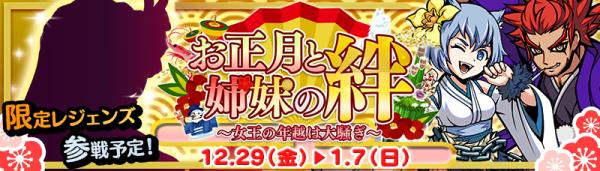 2017年12月29日(金)からイベントクエストでポイントを集め、報酬交換ボックスで報酬をゲットすることができる期間限定のシーズンイベント「お正月と姉妹の絆~女王の年越は大騒ぎ~」の開催を予定しています。皆様のご参加をお待ちしております!
