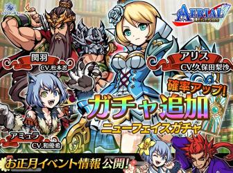 株式会社グッドラックスリー(本社:福岡県福岡市、代表取締役CEO:井上和久、以下「グッドラックスリー」)は、ハウステンボス株式会社(本社:長崎県佐世保市、代表取締役社長:澤田秀雄、以下「ハウステンボス」)と共同開発した、世界初テーマパークとの連動ゲームアプリ『エアリアルレジェンズ(以下、本作)』(http://aeriallegends-gl3.gl-inc.jp/)において2017年12月26日(火)から、キャラクター「アリス」「関羽」の追加および特定キャラクターの召喚確率がアップする「ニューフェイス」ガチャを開催いたしました。また、12月29日(金)から開催予定の「お正月と姉妹の絆~女王の年越は大騒ぎ~」イベント情報をお知らせいたします。