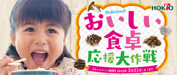 きのこ総合企業のホクト株式会社(所在地:長野県長野市、代表取締役社長 水野雅義)では、ご愛顧頂いている皆さまに感謝の気持ちを込めて、プレゼントキャンペーン「おいしい食卓応援大作戦」を開催します。キャンペーン期間は1月1日から3月31日まで。