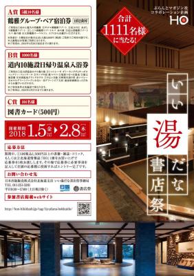 「いい湯だな書店祭」は、北海道で絶大な人気を誇る地元情報誌「HO」(発行:株式会社ぶらんとマガジン社、代表取締役社長:大鹿 寛)とのコラボレーション企画で、温泉ペア宿泊券や道内10施設で使用できる日帰り温泉入浴券などが抽選で当たります。お買い上げ金額1,500円以上、または「HO」をお買い上げで、応募券を1枚お渡しします。