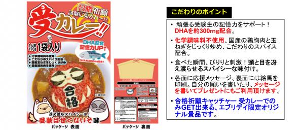 特筆すべきは、今年は受験生とその家族の為に、エブリデイオリジナルのレトルトカレー「受カレー」を開発し、景品として採用致しました。そして、記憶サポートに良いとされるDHAを配合したり、パッケージ表面には、縁起担ぎのだるまをモチーフにした「だるまカレー」を作成、裏面には願いやメッセージを書き込める絵馬を印刷するなど、細部にもこだわっており、味も食べるとぴりっと刺激のある、スパイシーな味付けで、受験の大変さとかけ「受験は甘くないぞ味」としました。