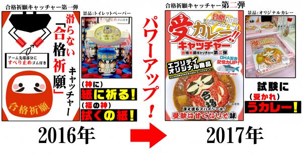 この度、登場致しました「合格祈願キャッチャー受カレー」は、昨年、多くのメディアにて紹介されるなど、大好評頂きました 合格祈願キャッチャーの第二弾となっており、クレーンゲームのギミック、そして景品と、全てがパワーアップし、前回の合格祈願キャッチャーから大きく進化致しました。