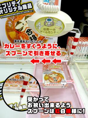 「合格祈願キャッチャー 受カレー」は合格祈願をコンセプトに作成されておりますので、合格を自らの手で引き寄せて頂こうという思いを、クレーンゲームのギミックや見た目に反映させました。 取り方としては、台に設置された景品をアームで取り出し口まで引き寄せて頂くものとなりますが、景品のカレーにちなんでアームの部分がスプーンとなっております。 また、当クレーンゲームはエブリデイ太田店でも遊んで頂く事が可能となっておりますが、エブリデイ行田店では特に、アームのスプーンが紅白柄で、縁起のよいデザインとなっております。 ぜひ、紅白スプーンでカレーと一緒に合格もゲットして頂きたいと思います。(※本リリースでは行田店の写真です。)