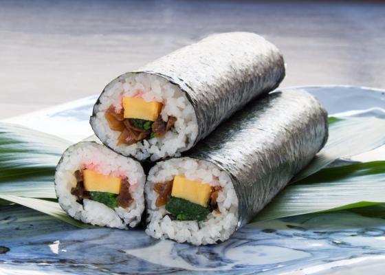 干ぴょう、煮しいたけ、玉子焼、ほうれん草、海老おぼろ入り