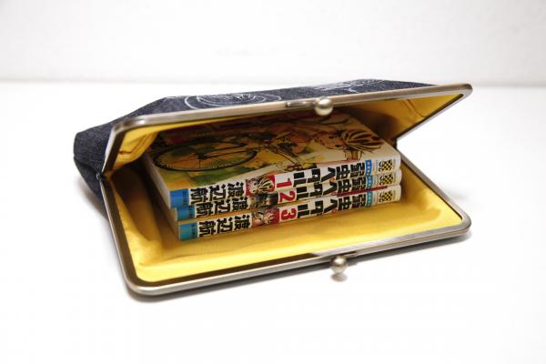 内生地は、弱虫ペダルに登場する総北高校のチームカラーである黄色を採用しました。コミック本が3冊入るA5サイズで、スマートフォンや手帳なども入れられます。内ポケットとカードホルダー(6枚分)付き。