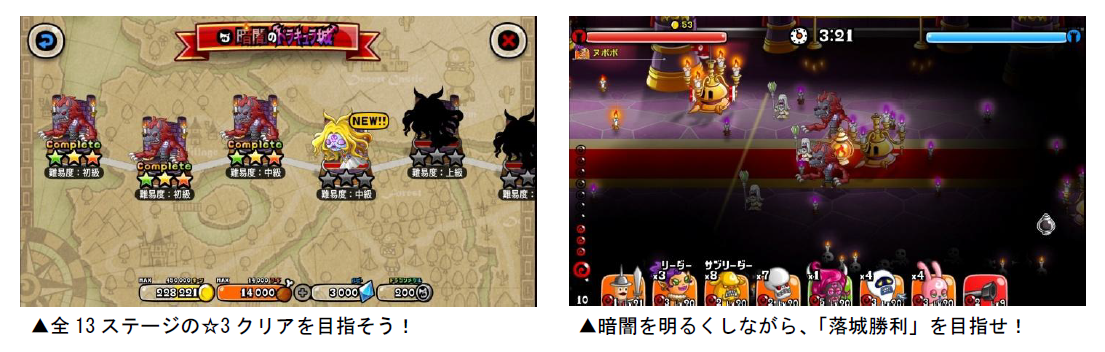 バトル内の「討伐イベント」から、「暗闇のドラキュラ城」に挑戦できます。本イベントは、敵の城を落城させないとステージクリアとならない特別ルールとなっています。「ひとりで」「みんなで」共に1日3回まで、ルビーの消費なしで討伐に挑戦できます。