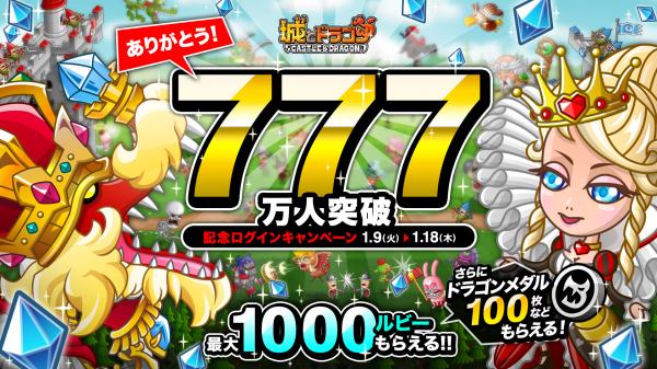 1月9日(火)より、『城とドラゴン』の登録ユーザー数が777万人を突破したことを記念して、「777万人突破記念ログインキャンペーン」を開催いたします。期間中、ゲームに毎日ログインすると最大1000ルビーやドラゴンメダル100枚などの豪華報酬がもらえます。