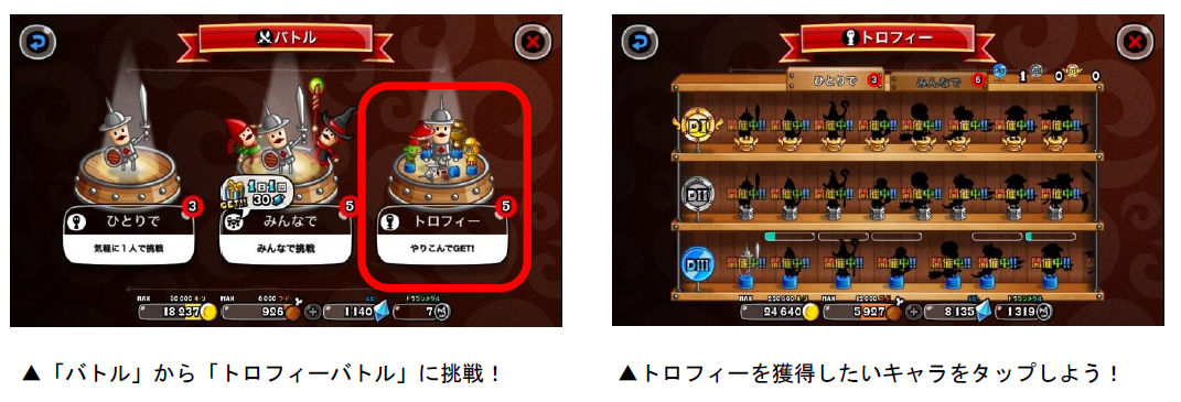 各キャラのトロフィーは、「トロP」を一定数貯めると獲得することができます。トロPは「キャラのLvが20以上」「うまP200以上」など、各キャラによって異なる条件を満たした状態でバトルを行なうと獲得できます。また、バトルを開始すると「ボーナスバトル」が発生することがあり、バトルの勝敗に関係なく、獲得トロPが2・3・5・10倍のうちいずれかの倍率で増加します。ボーナスバトルが発生したら、勝利してトロPの大量獲得を目指しましょう!