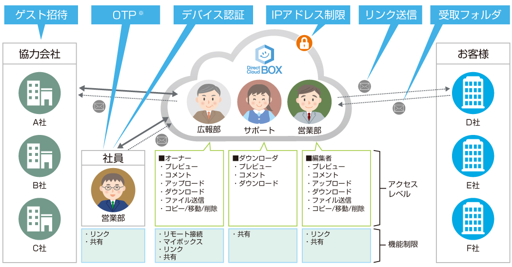 DirectCloud-BOXは、社内外でドキュメントを効率よく安全に共有・活用できるユーザー数無制限の法人向けオンラインストレージです。ゲスト招待、受取フォルダ、プレビュー、ファイルコメントなどの機能を使うことで、社内外間でコラボレーションを促進し、コスト削減と生産性の向上を実現します。また全社的に導入することで、社内のシャドーIT排除とコストダウンを両立できます。