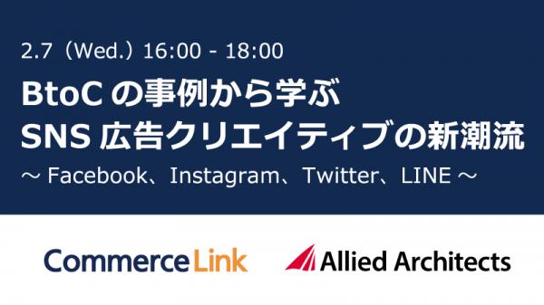 ECサイトの集客・売上拡大を支援するコマースリンク株式会社(本社:東京都大田区、代表取締役社長:藤田 由希子)は、アライドアーキテクツ株式会社(本社:東京都渋谷区、代表取締役社長:中村 壮秀)と共催で『SNS広告クリエイティブの新潮流 ~Facebook、Instagram、Twitter、LINE~』と題した無料セミナーを2018年2月7日(水)に開催します。