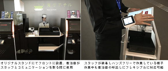 「変なホテル」では、世界一生産性の高いホテルの実現のために、ロボットの活用や運営スタッフの業務省力化を図っており、ホテル内のフロントやクローク等においてロボットがメインスタッフとして業務を遂行しております。そのため、フロント等の施設が無人であることから、宿泊客が運営スタッフとコミュニケーションを図りたい場合には、即時に通信可能であり、対応状況を運営スタッフ全員で共有できる通信手段が必要であり、また、運営スタッフ同士でコミュニケーションを取ることも業務効率化に必要となっております。