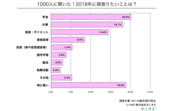 新しい年のはじまりは、目標や頑張りたいことを考える時期でもあります。2018年に頑張りたいこととして、最も多く回答が寄せられたのは「貯金」で20.2%。次いで、「仕事」18.1%、「美容・ダイエット」14.4%が続く結果になりました。