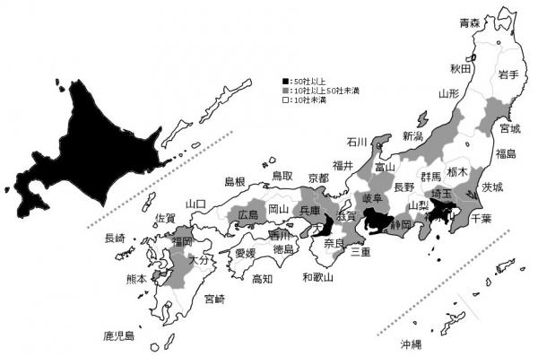 50社以上の通建業者を確認したエリアは東京都や神奈川県、大阪府、愛知県、北海道となった。特に東京都と大阪府には通建業者が集中しており、愛知県を含む東名阪のみで全国の約40%を占めている。なお、関東や東海、関西といった地方合算では、全国の65%を占めた。