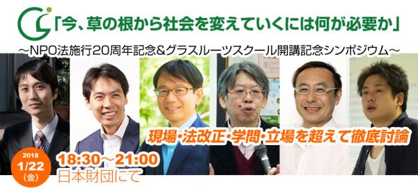 今回のシンポジウムでは現場・学問・法改正の立場それぞれの立場から市民セクターの発展に尽力され第一人者とも言える方々をお招きして、NPO法が施行されてからの20年を振り返りつつ、これから草の根からボトムアップで社会を変えていくにはどうすれば良いか、徹底討論します。