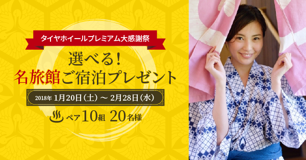 最上級の性能を持つプレミアムタイヤを専門に販売する 「タイヤホイール プレミアム」(https://www.tirewheel-ec.com/)が2018年1月20日(土)より、『選べる!名旅館ご宿泊プレゼント』キャンペーンを実施することとなりました。