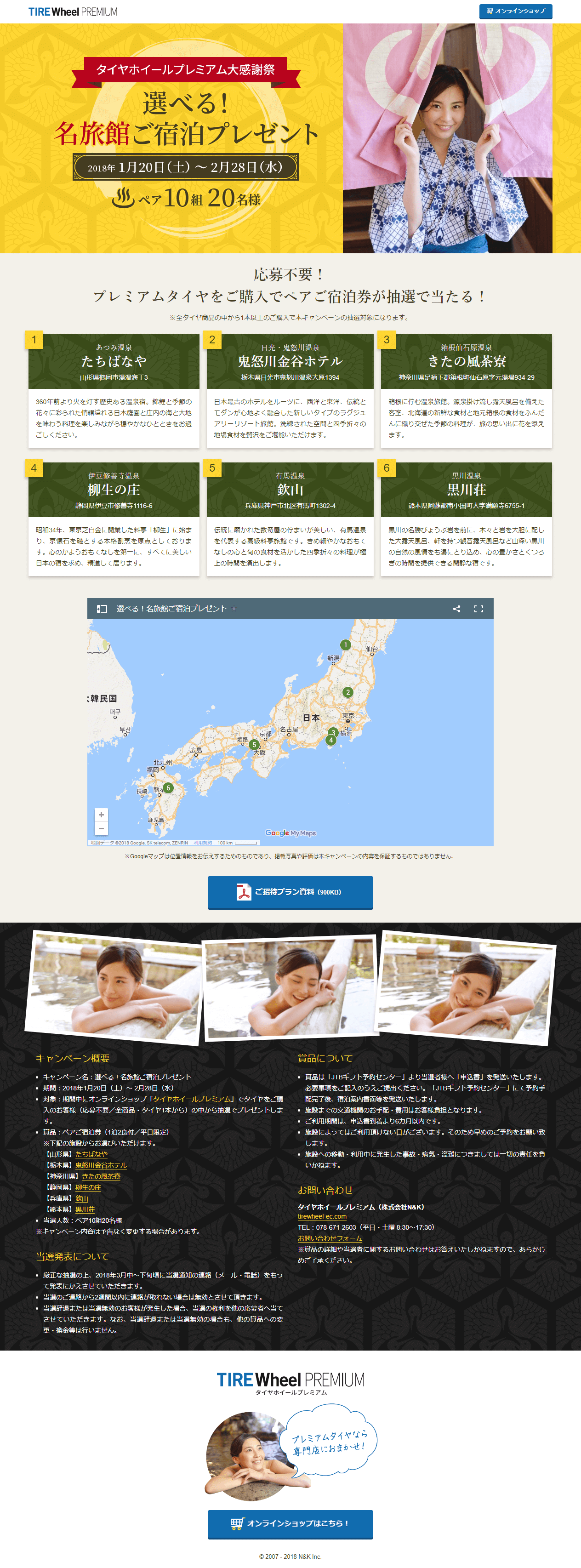 キャンペーン期間中に当オンラインショップでタイヤをご購入いただいたお客様の中から、抽選でペア10組20名様に国内6施設から選べるご宿泊券(1泊2食付/平日限定)をプレゼントいたします。