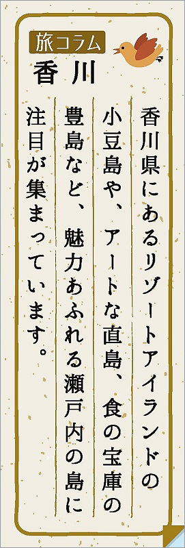 香川県にあるリゾートアイランドの小豆島や、アートな直島、食の宝庫の豊島など、魅力あふれる瀬戸内の島に注目が集まっています。