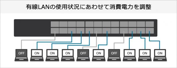有線LANの使用状況にあわせて消費電力を調整する、『EEE(Energy Efficient Ethernet)』に準拠。未使用ポートへの供給電力を制限する『LPI』機能と通信量によって伝送速度を調整しチップの消費電力を抑える『RPS』機能により、使用状況に応じて消費電力を自動で調整しますので意識することなく無駄な電力消費を抑えることができます。
