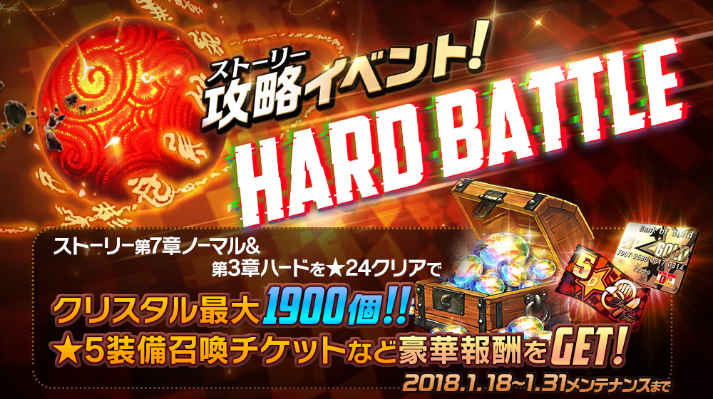また、ストーリー第7章の開放を記念し、クリスタル最大1,900個や★5装備召喚チケットなどがもらえるストーリー攻略イベント「HARD BATTLE」も開始となりましたので、お知らせいたします。