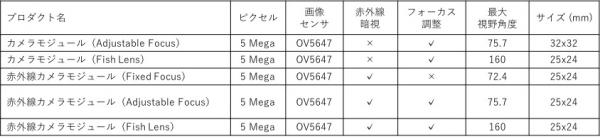 固定フォーカス、手動調整フォーカス、魚眼レンズの3種類の赤外線カメラモジュールの合計5種類となります。