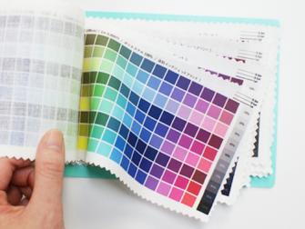 見本帳の生地には154色のカラーチップと色の値をプリントしています。色の値はHSB値、RGB値、グレースケールを使用しており、IllustratorやPhotoshopなどの描画ソフトで調整することでイメージ通りのオリジナル布・生地の作成に便利です。同じ色のデータでも布の種類や加工方法により仕上がりが異なるため、現在販売中の全ての布のサンプルをご用意しています。