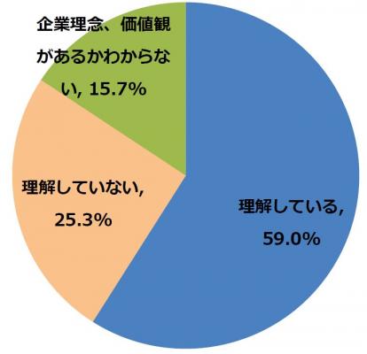 現在働いている会社の企業理念・価値観を理解しているか聞いたところ、「理解している」が59.0%、「理解していない」が25.3%という結果になりました。また、自分が働いている会社に「企業理念・価値観があるかわからない」という方も15.7%いることが分かりました。