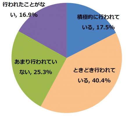 入社後、会社から理念や価値観についての説明研修やミーティングなど、時間をとって説明が行われているか聞いたところ、「積極的に行われている(17.5%)」、「ときどき行われている(40.4%)」、「あまり行われていない(25.3%)」、「行われたことが無い(16.9%)」という結果になりました。