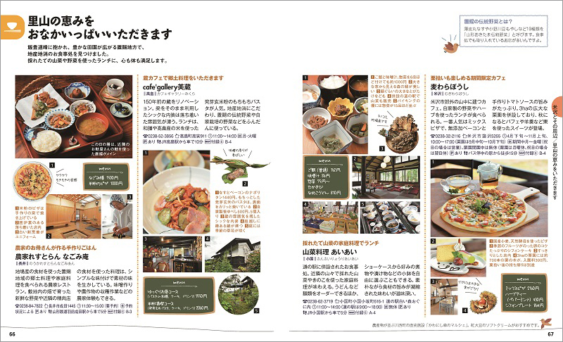 少し足をのばすと飯豊連峰の大自然が育むグルメ、里山レストランの山菜料理やフルーティなワインに出会えます。
