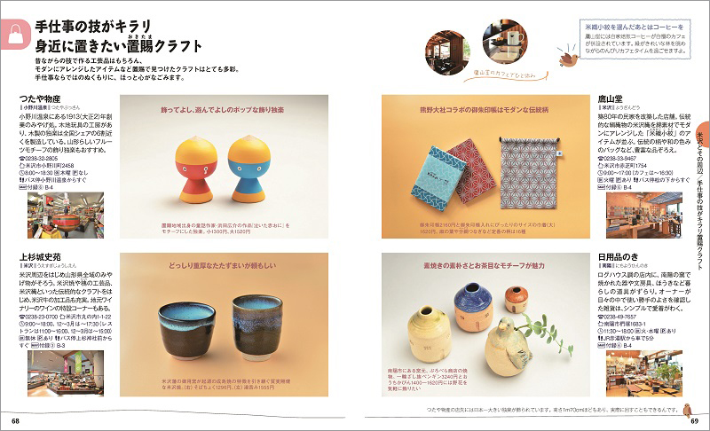 内陸部の南部は置賜(おきたま)地方と呼ばれ、その中心地、上杉氏ゆかりの米沢にはレトロなカフェやクラフト雑貨の店など、寄り道スポットがいくつもあります。