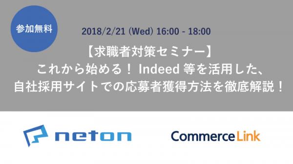 ECサイトの集客・売上拡大を支援するコマースリンク株式会社(本社:東京都大田区、代表取締役社長:藤田 由希子)は、株式会社ネットオン(本社:大阪府大阪市北区、代表取締役:木嶋 諭)と共催で『【求職者対策セミナー】これから始める!Indeed等を活用した、自社採用サイトでの応募者獲得方法を徹底解説!』と題した無料セミナーを2018年2月21日(水)に開催します。