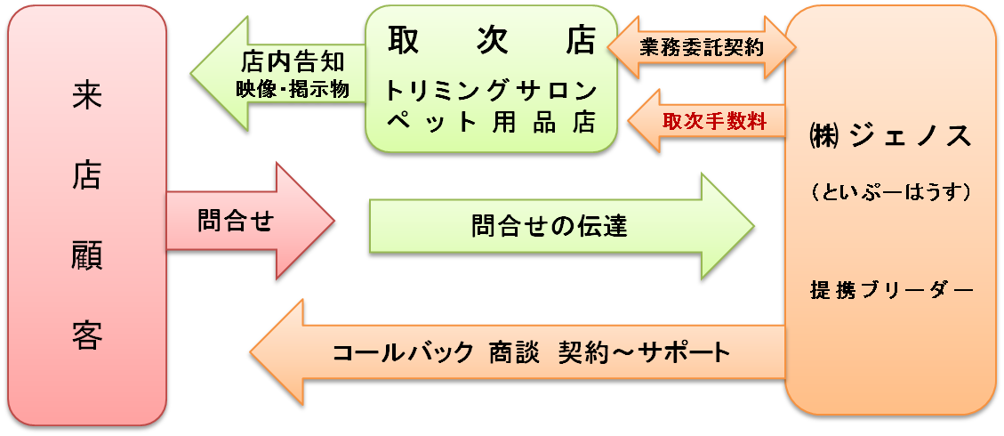 取次店は、子犬を斡旋することで、トリミングの利用や用品購入など新規需要の確保に繋がることで販売促進となり、取次手数料を得られる仕組みとなります。