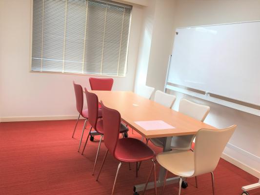 紅白の可愛らしい椅子、白い壁、窓から差し込む日差し。清潔感と明るさがある、人気の貸し会議室です。