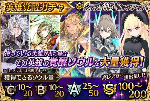 『英雄覚醒ガチャ』では、C~Sまでの英雄が出現するほか、自分が持っている英雄が重複して出現した場合に、その英雄の覚醒ソウルを大量に獲得できます。