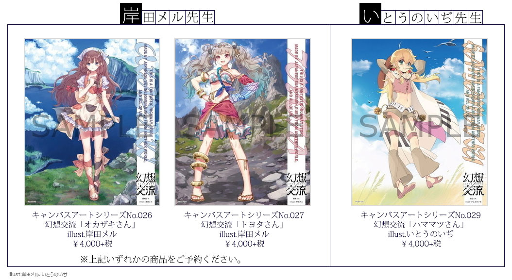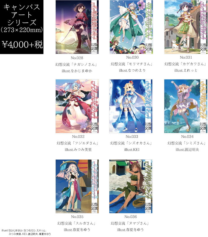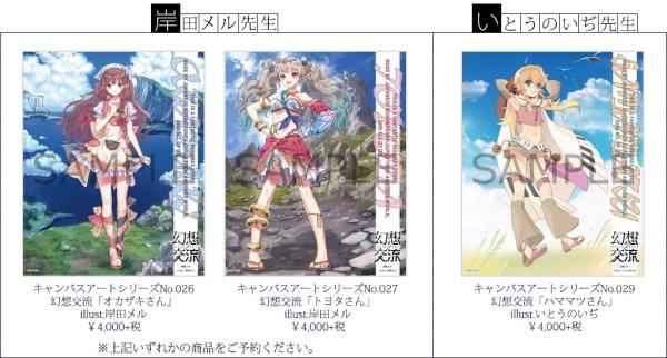 加えて、存在感のあるF3サイズ(273×220mm)の本物のキャンバス地に、人気イラストレーターによって生み出された可愛い少女たちの姿を高精細インクプリントで表現した『幻想交流』キャンバスアートも販売。また、イベント先行販売となるアクリルPOPや缶バッジ、カーマグネット、カーステッカーも会場内の物販にてお取扱い予定です。
